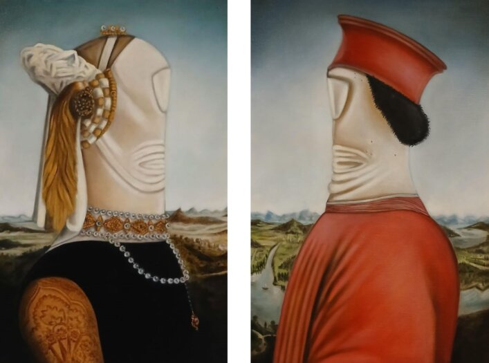 In the contemporary art scene, Raffaele Ciotola stands out as an innovative genius who blends tradition and modernity with his Finger Art Ciotola movement. His interpretation of Piero della Francesca "Double Portrait of the Dukes of Urbino" is not merely a reproduction, but an intimate and personal reimagining that captures the essence of the dukes through minimal gestures. The two works, each dedicated separately to Federico da Montefeltro and Battista Sforza, offer a fresh reading of these historical figures, transforming every stroke of the artist's finger into a physical and narrative act that evokes the grandeur and tensions of the Renaissance.